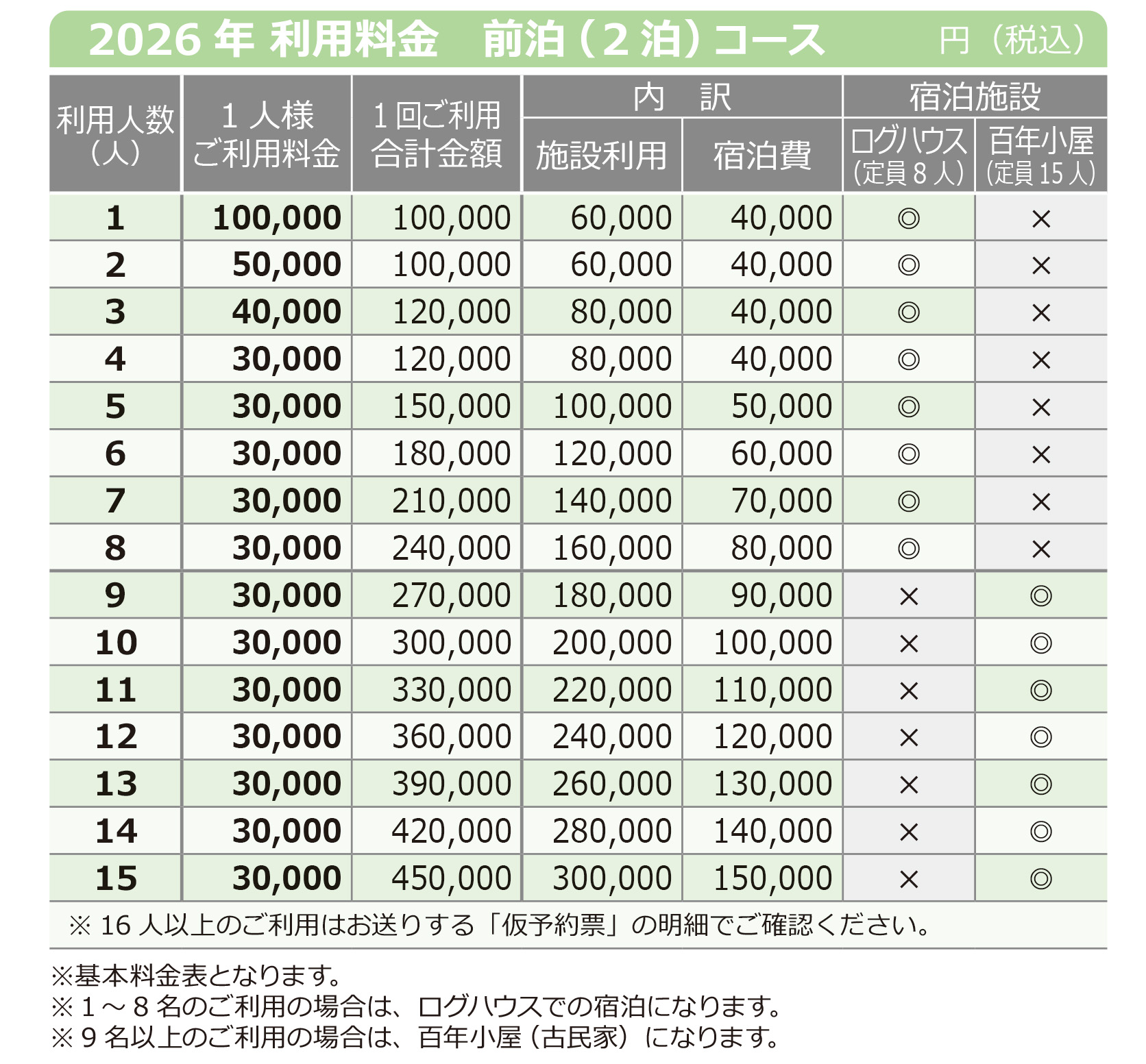 ■ ログハウス:1 ~ 8 人 古民家:9~15人